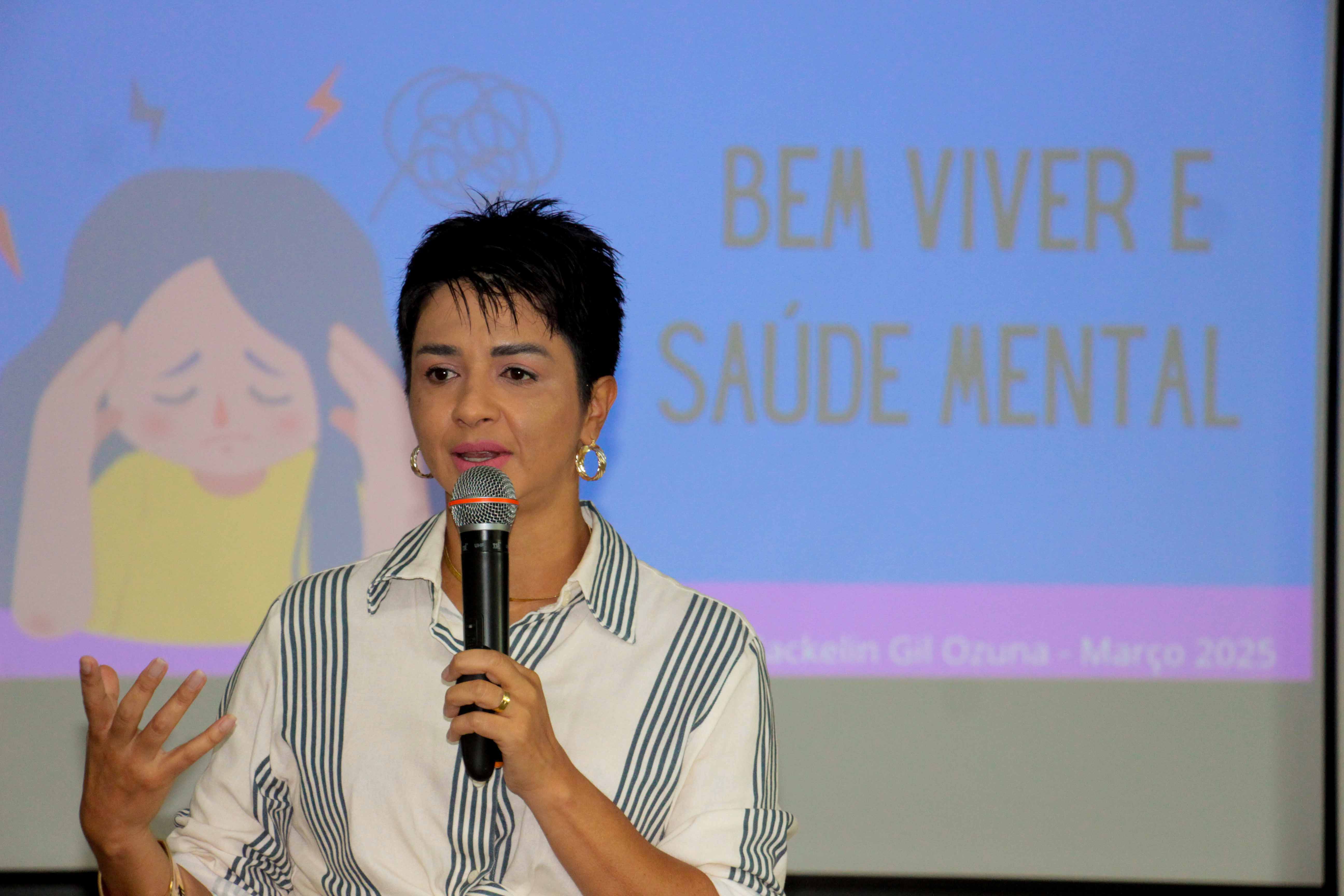 Durante a palestra, Dra. Jackelin discutiu o papel social das mulheres e a pressão exercida sobre elas. “Somos cobradas para sermos a ‘mulher-maravilha’, para darmos conta de tudo, e muitas acabam desenvolvendo ansiedade e depressão ao mesmo tempo”, afirmou. Ela explicou as características dessas doenças e destacou a importância de buscar equilíbrio para evitar o adoecimento.